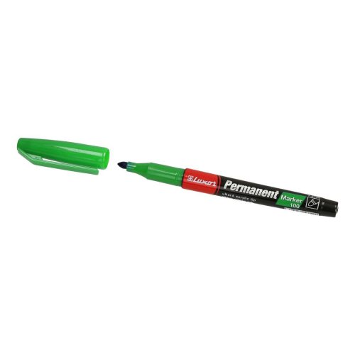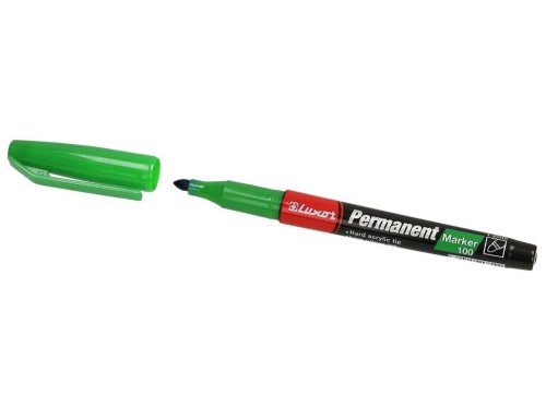 Permanentní popisovač LUXOR 100 zelený s kulatým hrotem lze použít na většinu povrchů.