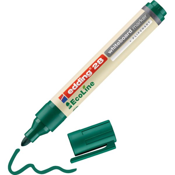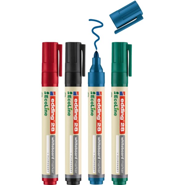 Sada čtyř popisovačů na bílé tabule z ekologické řady edding Ecoline Tělo popisovače je nejméně z 90 % vyrobené z recyklovaných materiálů Vyměnitelný hrot a možnost znovu naplnění vypsaného popisovače …