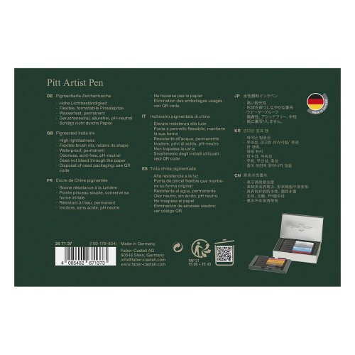 • 9x hrot B, 2x hrot FM, 1x hrot S, * pH neutrální inkoust bez obsahu kyselin, * inkoust je odolný proti působení slunečního záření, * po zaschnutí voděodolný, nerozmazávající se na papíře, * kvalitní štětečkový hrot zaručuje maximální pružnost a spolehlivý průtok inkoustu, * pigmenty nejvyšší jakosti, * plechové pouzdro