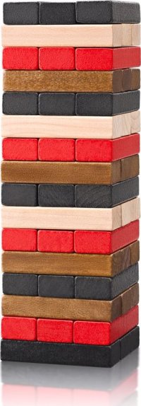 Heslo hry: ROVNOVÁHA. Velmi jednoduchá pravidla spočívají v tom, že hráči nejprve z dřevěných destiček postaví vysoký hranol – věž. Každé patro se skládá ze tří stejnobarevných destiček. Hráč na tahu hodí kostkou, vyjme jeden dílek odpovídající barvy, který nesmí být z nejvyššího patra a umístí ho na vrcholek věže. Při manipulaci se nesmí věž nijak přidržovat. Používat smíte pouze jednu ruku a dotýkat se pouze přesouvaného dílku. Komu věž jako prvnímu spadne, ten prohrál. Balení obsahuje: 48 kostek, hrací kostku, návod CZ.