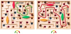 Naklápěj rovinu bludiště pomocí dvou postranních koleček a dostaň kuličku od startu do cíle. Dávej pozor, aby kulička nepropadla otvory dovnitř. Součástí bludiště jsou tři otočné zarážky, kterými si upravíš délku trasy. Obtížnost trasy si můžeš upravit přiloženými kolíčky, které jednoduše vložíš do otvorů v bludišti, aby Ti kulička nepropadla dovnitř. Vhodné pro děti od 3 let.