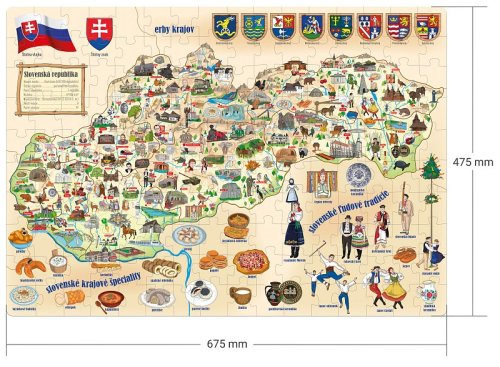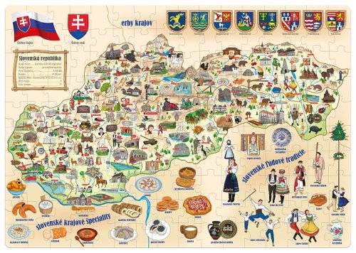 Zeměpisné puzzle pro děti s mapou Slovenské republiky a ilustracemi od výtvarnice Hany Vavřínové. Na mapě najdete lidové tradice, krajové speciality, vlajku či státní znak a další užitečné informace. Veškeré texty na mapě jsou uvedeny ve slovenském jazyce. Skládání barevných dílků rozvíjí u dětí postřeh, zručnost a soustředění. Obrázky představující zvířata, rostliny či budovy navíc stimulují u nejmenších dětí představivost a pomáhají jim poznávat věci charakterizující Slovensko. Rozměr složeného puzzle cca 67,5 x 47,5 cm