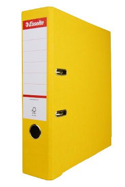 Mramorový papírový pákový pořadač se žlutými deskami a hřbetem.