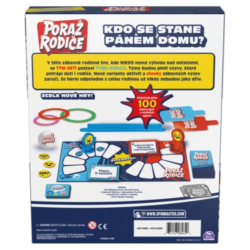 Kdo ovládne domácnost? Tým Děti se střetne s týmem Rodičů v této zábavné rodinné hře, kde nikdo nemá výhodu. Týmy plní výzvy, které otestují děti i rodiče stejnou měrou, tohle ale není klasická hra Poraž rodiče. Nové aktivní zvraty a stovky vtipných virálních výzev zaručí, že rodinné herní večery už nikdy nebudou stejné. Transformujte krabici a za pomocí vylamovacích dílů postavte 3D překážky pro výzvy, zatímco odpovídáte na kvízové otázky, které otestují všechny generace hráčů. Tato verze klasické deskové hry Poraž rodiče z roku 2025 obsahuje zcela nové hry a kvízy, které udrží všechny v rodině ve střehu. Pro 4–8 hráčů ve věku od 6 let. Spin Master přináší zábavu dětského světa až k vám domů – s pestrou nabídkou hraček a her pro děti, včetně hraček pro miminka, hraček pro dívky, stolních her, plyšáků, antistresových hraček, RC aut, akčních figurek, panenek a mnoha dalších. Rozviň svou kreativitu s výtvarnými a tvořivými hračkami i stavebnicemi a přenes akci ke stolu díky skládačkám pro dospělé nebo karetním hrám. Od dárků pro muže po dárky k narození miminek a hračky pro batolata. Díky našemu rozmanitému katalogu hraček pro děti bude dávání dárků hračkou.