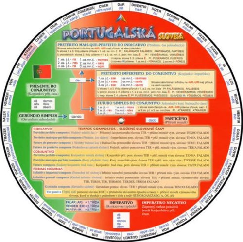 Jedinečné a gramaticky velmi obsáhlé oboustranné kolečko obsahuje celkem 92 nejpoužívanějších portugalských nepravidelných sloves. Pomůcka na obou stranách obsahuje gramatické tabulky s časováním pomocných sloves Haver, Ter, Estar, Ser a tvořením složených slovesných tvarů. Pomůcka je vhodná jak pro začátečníky, tak i pokročilé studenty portugalského jazyka.