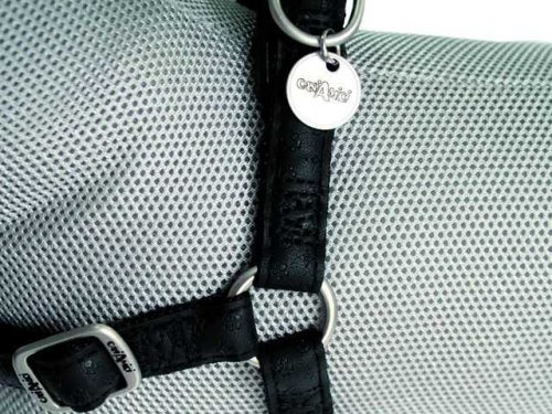 Kožený postroj černé barvy s celopotiskem, podšitý jemným nylonem ve stejné barvě.