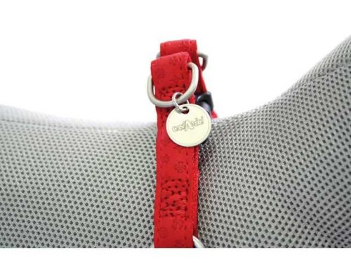 Kožený postroj červené barvy s celopotiskem, podšitý jemným nylonem ve stejné barvě.
