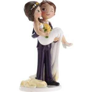 Svatební figurka představující ženicha, který nese nevěstu v náručí.