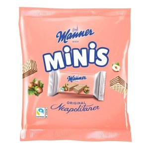 Křupavé oplatky Manner Neapolitaner Minis s krémovou oříškovou náplní (82%) na zahnání chuti na sladké Oplatky Manner se skládají z pěti vrstev jemných vaflí plněných čtyřmi vrstvami nejjemnější krémově …