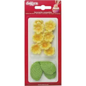 Cukrová dekorace obsahuje 8 žlutých květů kopretin a 5 zelených lístků.