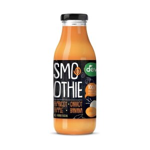 Ovocné smoothie DEVA vyrobené z kvalitního ovoce (meruňka, mrkev, jablko, banán), bez přidaného cukru a s přidaným vitamínem C, vhodné jako lahodná svačina Je bezlepkové a vhodné pro vegany Pasterováno …