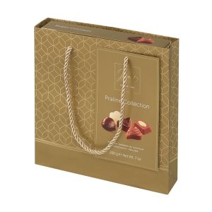 Kolekce belgických pralinek s mléčnou, hořkou a bílou čokoládou s mnoha lahodnými náplněmi a originálními tvary, včetně dárkové tašky Hmotnost: 200 g Rozměr: 20,5 x 20,5 x 4 cm