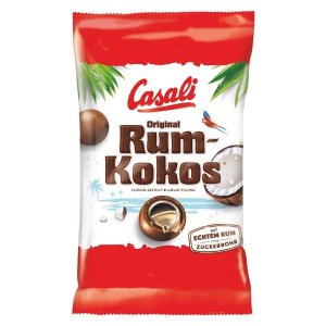 Kuličky Casali - čokoládová cukrovinka s alkoholovou náplní (10%), dražovaná, máčená v čokoládě (9%) a v mléčné čokoládě (59%) Hmotnost: 100 g