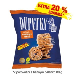 Dupetky jsou pečené preclíky posypané sezamem Jsou křehké a tenké vhodné jako svačinka Můžete si je vychutnat jako samotné nebo v kombinaci s různými mléčnými výrobky, např. tvarohem Hmotnost: 80 g