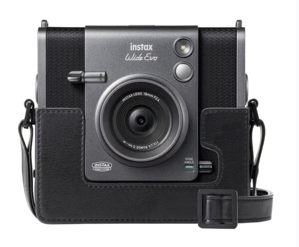 Kvalitní pouzdro pro fotoaparát Instax WIDE Evo spolu s nastavitelným ramením popruhem ve stejné barvě.