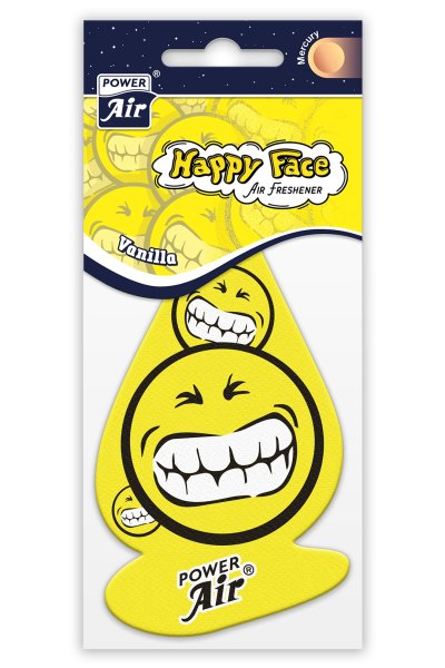 Papírový osvěžovač vzduchu na gumičce k zavěšení do volného prostoru v hravém designu emotikonů - "Smích", "Grimasa" a "Zuby".