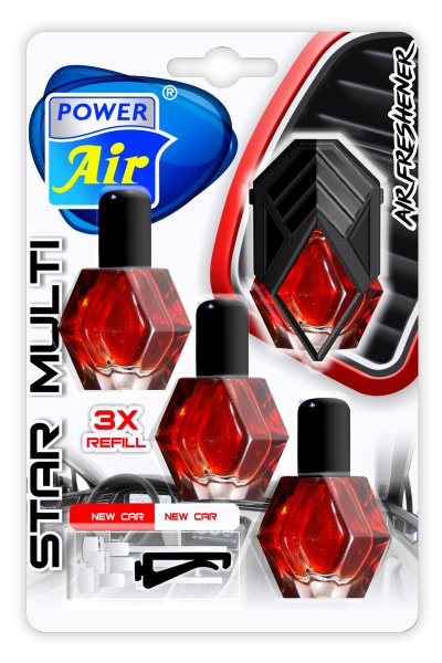 Osvěžovač POWER AIR Star Multi je kapalinový osvěžovač 3 v 1 o objemu 3 x 9 ml pro připevnění do mřížky. V balení pouzdro ("strojek"), sponka a 3 osvěžovače. Pracuje na strojkovém mechanismu, intenzitu vůně je možné si regulovat.