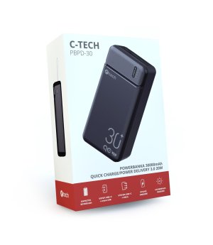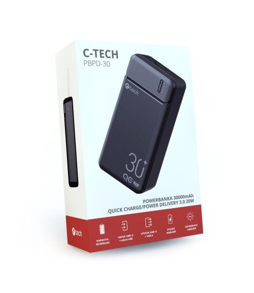 Predstavujeme vám novou powerbanku C-tech PBPD-30 s kapacitou 30000mAh, která v sobe spojuje výkon, rychlost a elegantní design. Tato powerbanka využívá pokrocilé Li-pol clánky, což zajištuje spolehlivý a dlouhotrvající zdroj energie pro vaše mobilní zarízení.