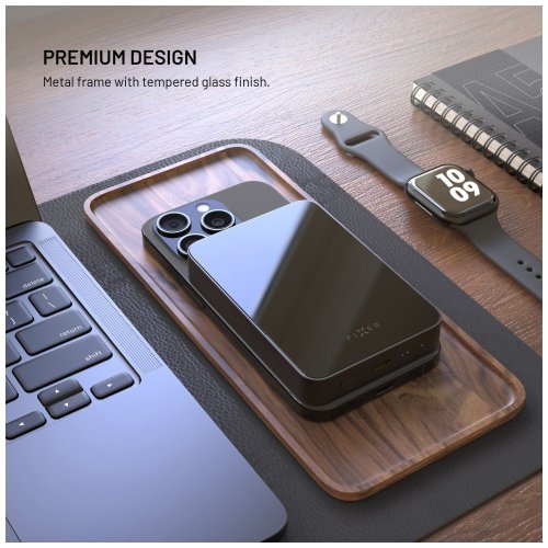 Tělo powerbanky kombinuje hliníkovou slitinu a tvrzené sklo, což zajišťuje vysokou odolnost i moderní vzhled. Kompaktní rozměry 100 × 68 × 15,43 mm a hmotnost 208 g umožňují snadné přenášení.