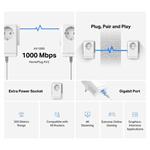 Každý adaptér obsahuje integrovanou zásuvku, která pojme zařízení s příkonem až 16 A. Získáte tak internetové připojení bez ztráty zásuvky – pohodlné a praktické řešení pro každodenní použití.