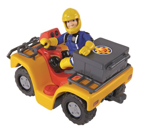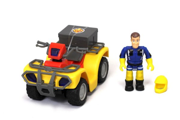 Požárník Sam se čtyřkolkou a příslušenstvím. Rozměry čtyřkolky: 12 x 7,5 x 7 cm.
