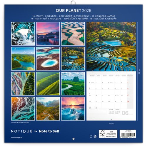 Dvanáct překrásných krajinných fotografií z různých koutů světa. Kalendář obsahuje přehledné kalendárium od září 2025 do prosince 2026v šesti jazycích, měsíční fáze, důležité svátky a prostor pro poznámky na každý den.