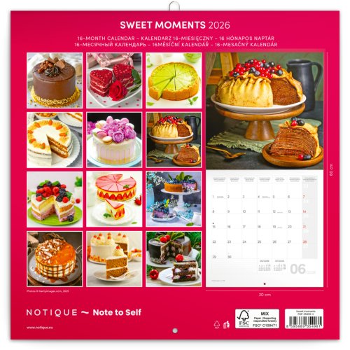 Jedinečný kalendář pro všechny milovníky sladkostí! Ochutnejte různé druhy dortů na stránkách tohoto kalendáře. Uvnitř najdete šestijazyčné kalendárium, měsíční fáze, důležité svátky a prostor pro vaše poznámky a plány.