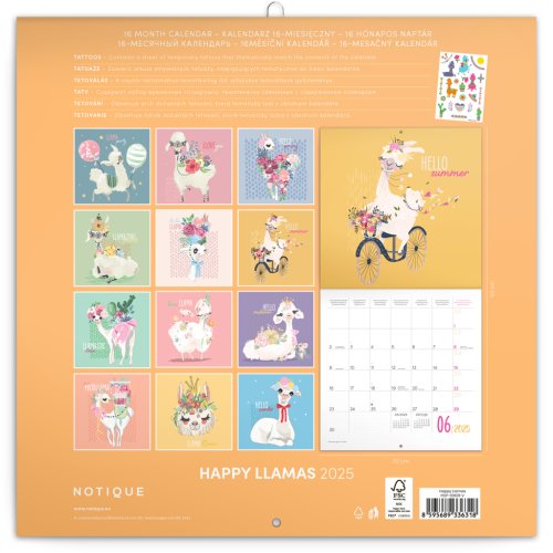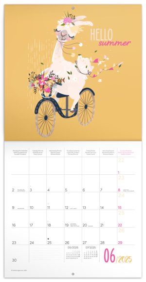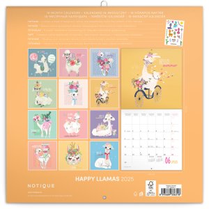 Ilustracím dominují lamy zachycené ve všech možných situacích. Uvnitř kalendáře najdete přehledné kalendárium od září 2024 do prosince 2025 v šesti jazycích, fáze měsíce, důležité svátky a prostor pro poznámky na každý den. Kalendář obsahuje arch dočasných tetovaček, se kterými si užijete spoustu legrace.