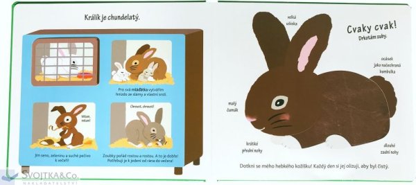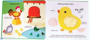 Milují vaše děti poznávání zvířat nejen očima a chtějí si na vše ideálně samy sáhnout? Právě pro ně jsou určeny knížky Poznávej dotykem. V této se podívají na statek, kde bydlí všelijaká užitečná zvířata. Povrchy jejich těl jsou různé. Kuře má hebká pírka, prase štětinatou kůži a ovce huňatou vlnu. A kdo se to ukrývá pod odklápěcím okénkem? Není to králík v kotci? Děti musejí při čtení dobře hledat - statek je plný překvapivých míst, kde se nacházejí nejrůznější zvířata! Nechte děti zapojit více smyslů a doslova se dotknout farmářského prostředí.