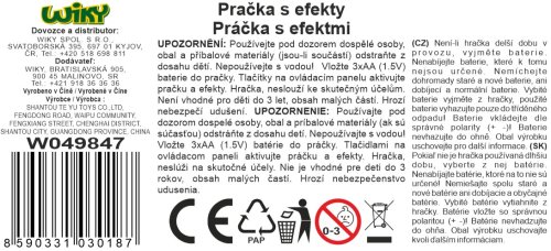 Pračka s efekty. Rozměry 18.5x22x24.5cm. Po zapnutí on/off tlačítkem, zvolte program a tlačítko go/stop zapne praní. baterie 3xAA nejsou součástí.