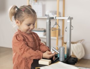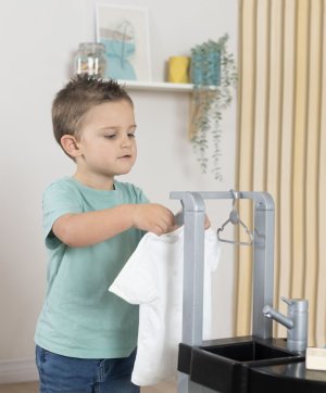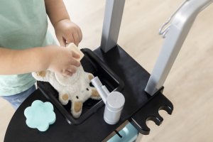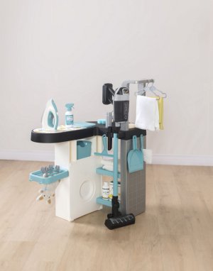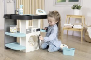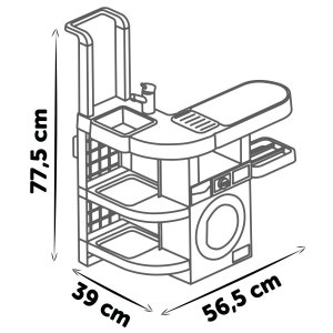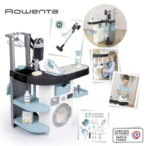 Prádelna 3 v1 s žehličkou a dokonalou replikou vysavače Rowenta X Force Flex se zvukem. Součástí je 17 realistických doplňků: koš na prádlo, ramínka, kolíčky na prádlo, mýdlo, žehlička, krabice s pracím práškem, kartáč, prchovka atd. 4 hrací části - pračka, umyvadlo pro ruční praní, sušící část a žehlící deska. Rozměry výrobku (DxŠxV): 56,5 x 39 x 77,5 cm. Hmotnost: 3,46 kg.
