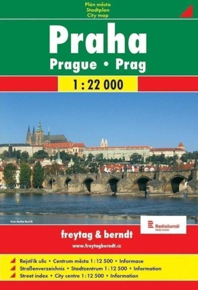 Atlas Prahy v kapesním formátu od vydavatele Freytag Berndt.Uliční síť s vyznačenými jednosměrkami, trasy a zastávky MHD. Symbolické znaky pro obchodní domy, nemocnice, kina, divadla, parkoviště a mnoho dalšího. Zvýrazněny veřejné budovy (státní instituce, školy, památky). Součástí atlasu je podrobnější mapka historického centra a průjezdní plán metropole. V zadní části atlasu se nachází rejstřík ulic.