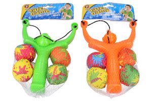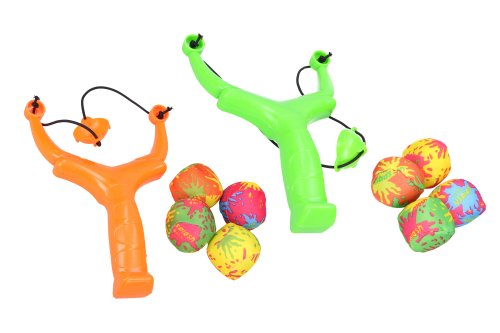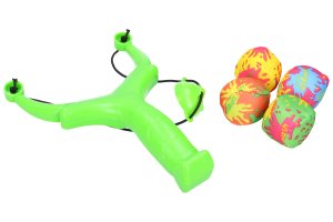 Prak s vodními bombami. Velikost praku 21 cm. Obsahuje prak, 4 vodní bomby. 2 varianty - zelená, oranžová.