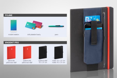 Praktický návlek na diář, který má prostor na dvě kreditní karty, mobilní telefon a uchýt na pero.