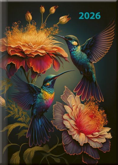 Praktický a skladný denní diář s motivem kolibříků. Elegantní diář menšího formátu, zdobený jemným květinovým motivem.