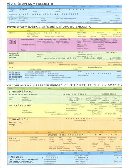 Tabulka - Doplňující školní pomůcka k dějepisnému atlasu. - PRAVĚK Vývoj člověka Hlavní pravěká období v Evropě Naše země v pravěku - STAROVĚK První státy světa Antické Řecko a Řím Periodizace vývoje, hlavní dějinné mezníky a kulturní období. Významné státy, jejich panovníci, politici, vojevůdci, umělci a vědci. Slavné bitvy, největší války, politické a kulturní dění, zákony,náboženství, umělecká díla. Doplňuje Dějepisné atlasy