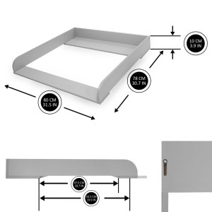 Dřevěný přebalovací nástavec. Snadná montáž a rozložení. Přední deska tohoto přebalovacího pultu je flexibilní a lze ji posouvat až o 4 cm. Rozměry: 80 (š) x 78 (h) x 10 (v) cmVhodné pro položky IKEA:1. Nordli (hloubka 47 cm)2. Malm (hloubka 48 cm)3. Hemnes (hloubka 50 cm)