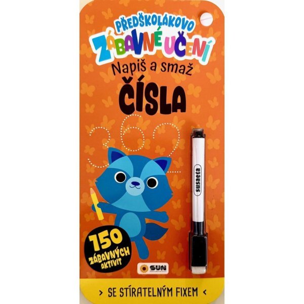 Kniha 150 zábavných aktivit – Předškolákovo zábavné učení: ČÍSLA- napiš a smaž - představuje novou, hravou formu výuky, která děti nejen pobaví, ale zároveň rozvíjí jejich asociační schopnosti, paměť, orientaci i představivost. Určena je především předškolákům, kteří si procvičí správné držení tužky a uvolnění ruky a naučí se čísla. Tato vzdělávací série je navržena tak, aby děti předškolního věku hravě naučila psát a rozumět číslům od 1 do 20. Postupně je vede od jednoduchého rozpoznávání a psaní jednotlivých číslic až po chápání složení čísel, jako jsou jednotky a desítky, což je základní předpoklad pro porozumění dvouciferným číslům. Děti si procvičí nejen psaní číslic, ale i jejich správný tvar (formu), což podporuje jemnou motoriku a uvolnění ruky. Součástí výuky jsou i základní jednoduché příklady sčítání, které pomáhají pochopit nejen matematické operace, ale i princip tvorby čísel. Výuka je doplněna zábavnými aktivitami, jako jsou bludiště či hravé úkoly, které udržují dětskou pozornost a prodlužují motivaci k učení. Série tak nabízí dlouhodobou a efektivní podporu při osvojování číselné gramotnosti v raném věku. Díky této metodice děti snadno zvládnou první psané čísla, naučí se spojovat číslice do větších celků a zároveň získají první zkušenosti s jednoduchými matematickými operacemi, což je skvělým základem pro další školní vzdělávání. Knihu lze použít pro přípravu na školní zápis. Učení u děti rozvíjí jejich zrakové vnímání, prostorovou orientaci, jemnou motoriku a schopnost rozlišovat a porovnávat předměty podle velikosti, barvy a tvaru. Tyto dovednosti jsou důležité pro správné pochopení a zvládnutí psaní a dalších školních dovedností. Tyto úkoly se často objevují při zápisu do školy. Kniha má praktický a příjemný formát, je k ní připojena mazací fixka, kterou děti mohou tahy snadno smazat, opravit a opakovat úkoly znovu. Celá koncepce je chytrá, zábavná a šetrná. Vstupte s nimi do světa dobrodružství, kde učení není nikdy nudné!