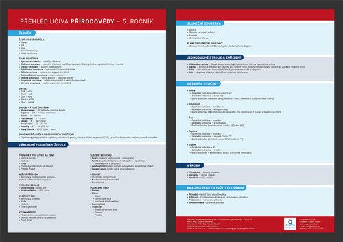 Přehledně zpracovaný přehled učiva pro pedagogy podle potřeby žáků.Přehledová tabulka – Přírodověda II. - učivo 5. třídy základní školy. Tabulka přináší ucelené učivo Přírodovědy 5. třídy. Učivo je rozfázované podle RVP ZV - člověk, základní podmínky života, sluneční soustava, jednoduché stroje a zařízení, měření a veličiny, výroba a krajina podle využití. Přehledová tabulka slouží pro žáky prvního a druhého stupně. Přehledová tabulka je pomocníkem pro žáky se speciálními vzdělávacími potřebamiPřehledová tabulka je vhodná pro žáky připravující se na víceletá gymnázia