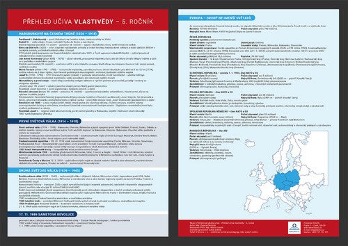 Přehledně zpracovaný přehled učiva pro pedagogy podle potřeby žáků.Přehledová tabulka – Vlastivěda I. (5. ročník) - přehled učiva - obsahuje přehled historie od nástupu Habsburků po současné dějiny a ucelený přehled základních informací o České republice a Evropě. Tabulka je vhodná pro žáky prvního stupně základní školy. •Přehledová tabulka slouží pro žáky prvního a druhého stupně. •Přehledová tabulka je pomocníkem pro žáky se speciálními vzdělávacími potřebami•Přehledová tabulka je vhodná pro žáky připravující se na víceletá gymnázia