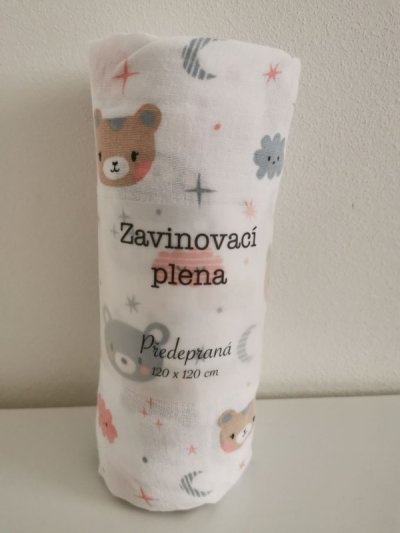 PREM Zavinovací předepraná plena s potiskem Méďa mráček 120/120 Kvalitní zavinovací předepraná bavlněná plena s potiskem 120x120cm. Zavinovací plena je vyrobena z čisté bavlněné příze, která je předepraná a je nejlepší pro styk s jemnou dětskou pokožkou. Zavinovací plena je jemná, měkká a příjemná na dotyk - je jemnější a měkčí než klasická plenka. Zavinovací plenku lze vzhledem k její velikosti 120x120 cm použít také jako osušku, plenku na kočárek, lehkou přikrývku v parných dnech, přikrývku při kojení, nebo jako podložku pod mimiko do postýlky i do kočárku. Zavinovací plenku lze vyvářet na 95°C, žehlit na vysoký stupeň. Vysoká kvalita šití minimalizuje možnost třepení. 1.jakost Gramáž: 110 gramů/m2, Certifikát Oeko-tex Standard 100 Materiál: 100% Bavlna - předepraná Rozměr: 1x120/120 cm