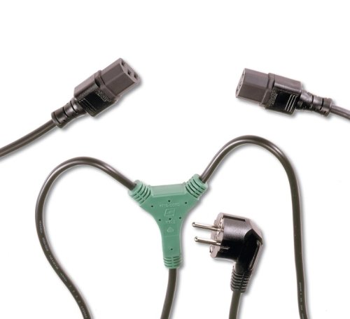 Napájecí kabel v černém provedení pro počítač nebo monitor s rozdvojením. Třížilový kabel pro napětí 230V.