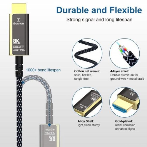 *HDMI 2.1 Ultra High Speed aktivní optický fiber kabel, podporuje HDMI2.1 nebo nižší HDMI2.0 a HDMI1.4 *Podporuje Ultra High Definition rozlišení 8K@60Hz, 4K@120Hz, YUV 4:4:4 *Maximální datový přenos: 48 Gb/s *Hybridní optický kabel o průměru 5mm - 4x optické vlákno OM3 + 7x vodičů *Pozlacené konektory: HDMI typ A (19pinů) male <=> HDMI typ A (19pinů) male *Rozlišení: 8K UHD (7680p) při 60Hz, 4K UHD (3840p) při 120Hz nebo nižší podporované formáty 1080p FULL HD/1080i/720p/720i *Optický kabel je zpětně kompatibilní k HDMI 2.0a, 2.0, 1.4 a nižší verzi *Podporuje eARC, ARC, HEC, EDID, DDC *Podporuje CEC ( Consumer Electronics Control ) *Podporuje HDR (High Dynamic Range) *Podporuje VRR (Variable Refresh Rate), ALLM (Auto Low Latency Mode) *Podporuje 4:4:4 barevný Subsampling *3D video po HDMI připojení *Podporuje HDCP1.4/HDCP2.2/HDCP2.3 *Multi-Dimensional Audio Formats Supported (Dolby Atmos and DTS:X etc.) *Dolby TrueHD and DTS-HD Master Audio Bitstream Compatible *Podporuje Audio Return Channel (ARC) *Kompatibilní s HDMI Ethernet Channel (HEC) *Support EDID *Kompletní napájení se sběrnice HDMI spotřeba menší 250mW, nepotřebuje externí napájení *Tloušťka optického kabelu 5mm *Optické vlákno: OM3 Multimode Fibre Optic *Kabel potažen opletem *Pozlacené konektory v kovových krytkách *Flexibilní optický kabel pro malý radius ohybu: 20mm *Optický kabel je zabalen v papírové krabici s návodem a polepen štítkem s popisem a EAN kódem *Rozměry konektoru: VxŠxH / 51x19x9mm (rozměry konektoru bez průchodky) *Podpora konzole Sony PS5 *Barva kabelu: černo/bílý oplet *Barva konektoru: černá/béžová *Délka kabelu: 20 m