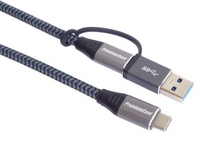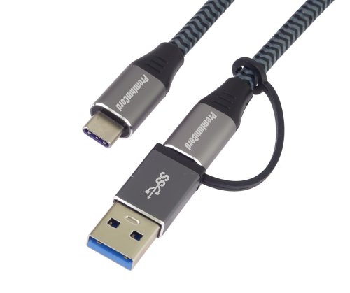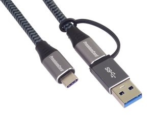 PremiumCord USB-C kabel ( USB 3.2 GEN 2x2, 5A, 100W, 20Gbit/s ) hliníkové krytky konektorů, bavlněný oplet + redukce USB-C/USB A 2m - První konektor: USB 3.2 typ C samec - Druhý konektor: USB 3.2 typ …