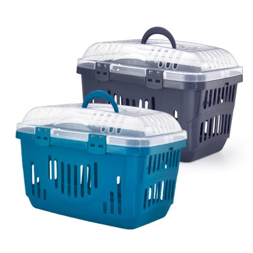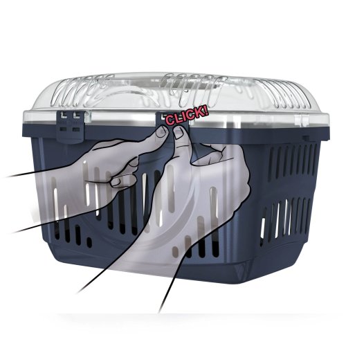 Plastová přepravka s horním otevíráním a transparentním víkem pro snadnou kontrolu zvířete.