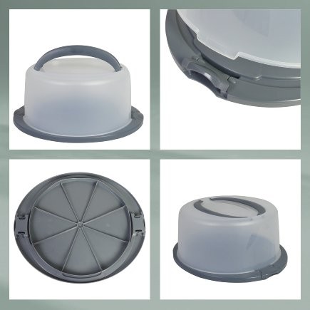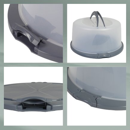 Dortová dózaDvě praktické rukojeti usnadňují přepravu a 2 boční chlopně na spodní desce zajišťují, že plastový kryt je připevněn ke spodní desce.- barva: tmavě šedá- materiál: PP plast- průměr spodního tácu: 38 cm- průměr víka: 33 cm- výška: 17 cm