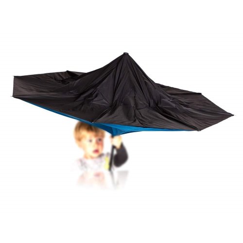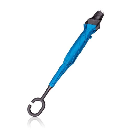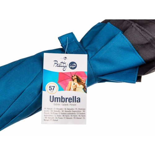 Deštník skládací 57 cm v modré barvě, slouží k ochraně proti dešti a přímému slunci. Je vyroben z nepromokavého materiálu polyester. Skládá se obráceně tak, aby se voda snadno vylila z deštníku a zabraňuje nežádoucímu zamokření okolí.