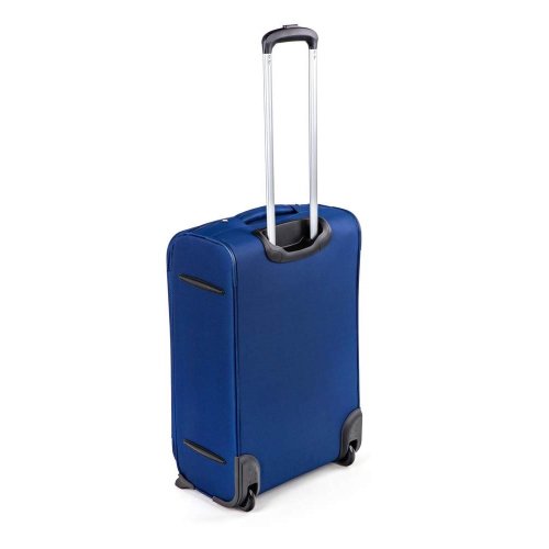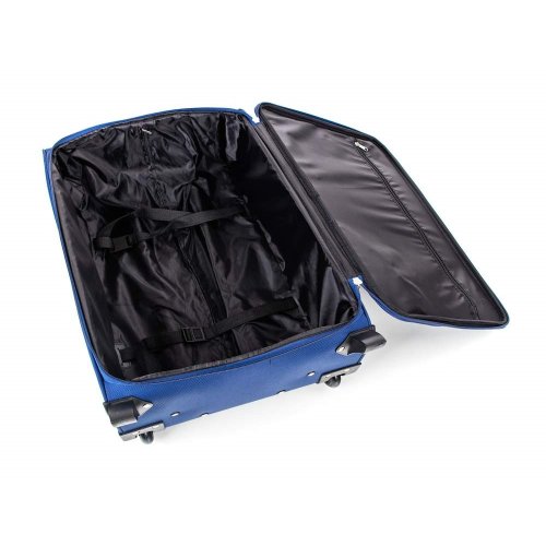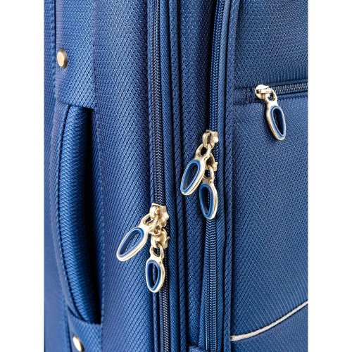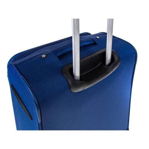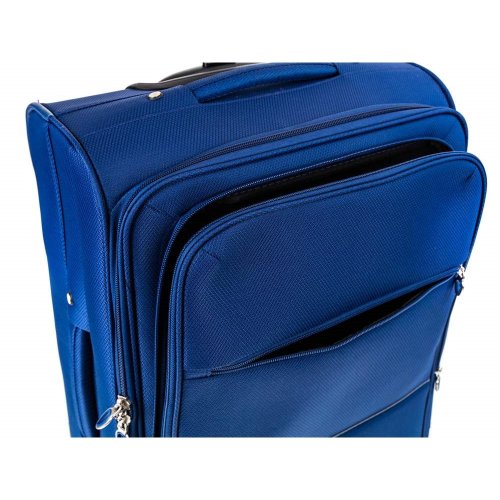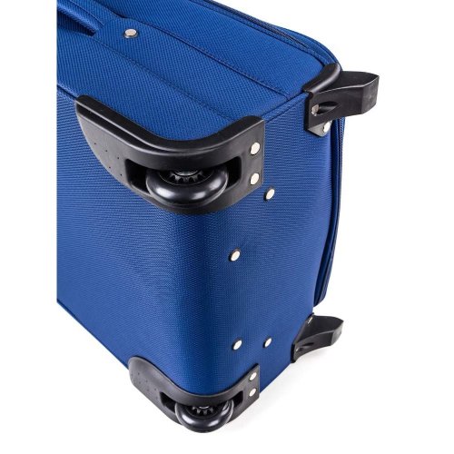 Cestovní textilní kufr 24'' v modré barvě, je vyrobený z textilie, což zaručuje nízkou hmotnost zavazadla. Je opatřený 2 kolečky pro snadné přemístění zavazadla. Kufr má 2 textilní madla (boční a horní) a 1 plastové s teleskopickou rukojetí s pojistkou proti zasunutí a možností nastavitelné výšky ve více polohách. Ve vnitřním prostoru naleznete jistící popruhy a vnitřní kapsu pro lepší fixaci a uspořádání vašich věcí. Dále má vnější kapsu pro umístění drobnějších věcí. Kufr se uzavírá na zip. Nosnost cestovního zavazadla je 18 kg.