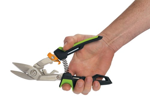Převodové nůžky na plech, offsetové pro pravý střih. Jsou ideální pro stříhání různých odolných materiálů, včetně plechu, potrubí, sádrokartonových rohů, kovových svorníků, lišt, podhledů, římsových desek, okapových lišt, okapů a dalších materiálů. Mají čepele s patentovanou technologií PowerGear - převodový systém, který poskytne o 40 % více síly, zejména v nejtěžší části střihu. Offsetové čepele umožňují stříhání středem plátu, zatímco ruka je bezpečné mimo ostrý kov. Střižná kapacita: ocel válcovaná za studena až do tloušťky 1,214 mm nebo nerezovou ocel až do tloušťky 0,644 mm. Délka střihu: 13,97 cm. Výška: 35 mm, délka: 295 mm, šířka: 105 mm, hmotnost: 460 g. Záruka: 5 let.