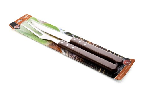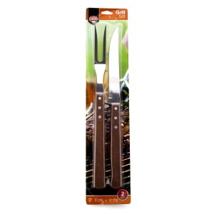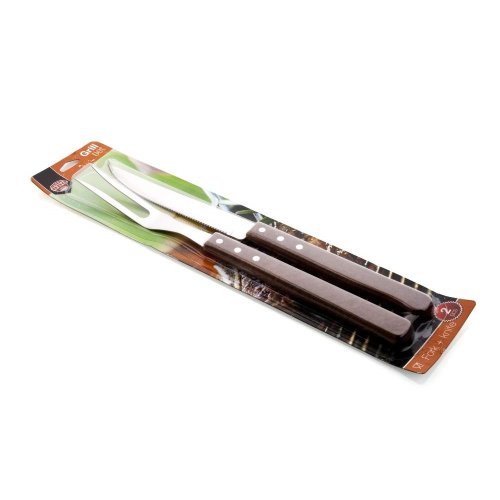 2dílná sada na grilování se skládá z dlouhého nože a vidličky s dřevěnou rukojetí. Pracovní část je vyrobena z nerezi, síla čepele: 1,5 mm - nůž i vidlička, povrchová uprava čepele: lesk, celková délka nože: 38 cm, délka čepele: 19 cm. Síla držadla 1,35 cm, šířka držadla 2,4 cm. Celková délka vidličky se dvěmi hroty. 38 cm, délka držadla 22 cm, síla držadla 1,4 cm šířka držadla 2,4 cm.